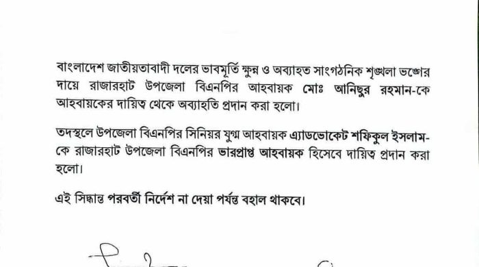 ইব্রাহিম আলম সবুজ রাজারহাট (কুড়িগ্রাম) প্রতিনিধি: বাংলাদেশ জাতীয়তাবাদী দলের ভাবমূর্তি অক্ষুণ্ণ রাখা ও সাংগঠনিক শৃঙ্খলা রক্ষার স্বার্থে কুড়িগ্রামের রাজারহাট উপজেলা বিএনপির আহ্বায়ক মোঃ আনিছুর রহমানকে দায়িত্ব থেকে অব্যাহতি